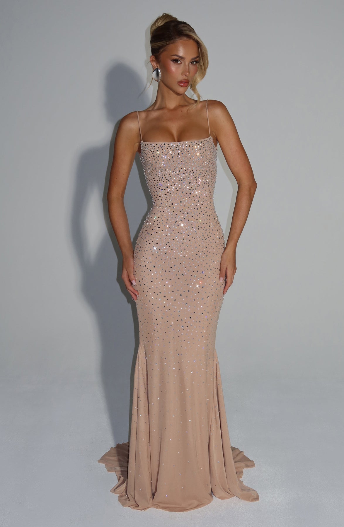 The Lorelei Gown features stretch mesh adorned with multi-shaped hotfix rhinestones in a gradient pattern. It offers a square neckline with fine shoulder straps, an open lace-up back, and ruching across the center back. The fit-and-flare skirt includes godets at the sides and centre back, finished with a small train for a sophisticated silhouette.